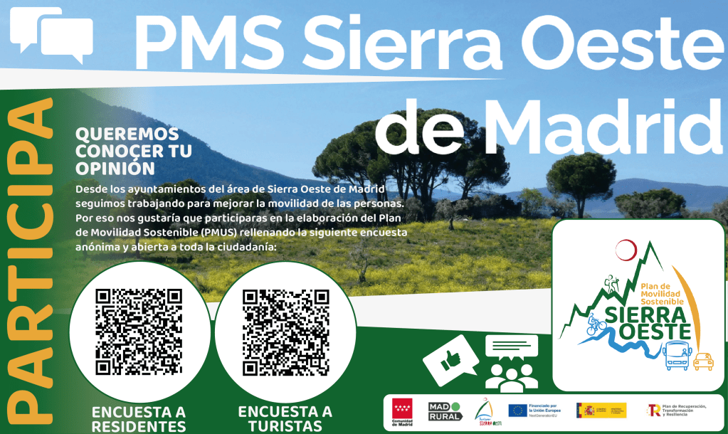 Desde los ayuntamientos del área de Sierra Oeste de Madrid seguimos trabajando para mejorar la movilidad de las personas. Por eso nos gustaría que participaras en la elaboración del Plan de Movilidad Urbana Sostenible (PMUS) rellenando la siguiente encuesta anónima y abierta a toda la ciudadanía: